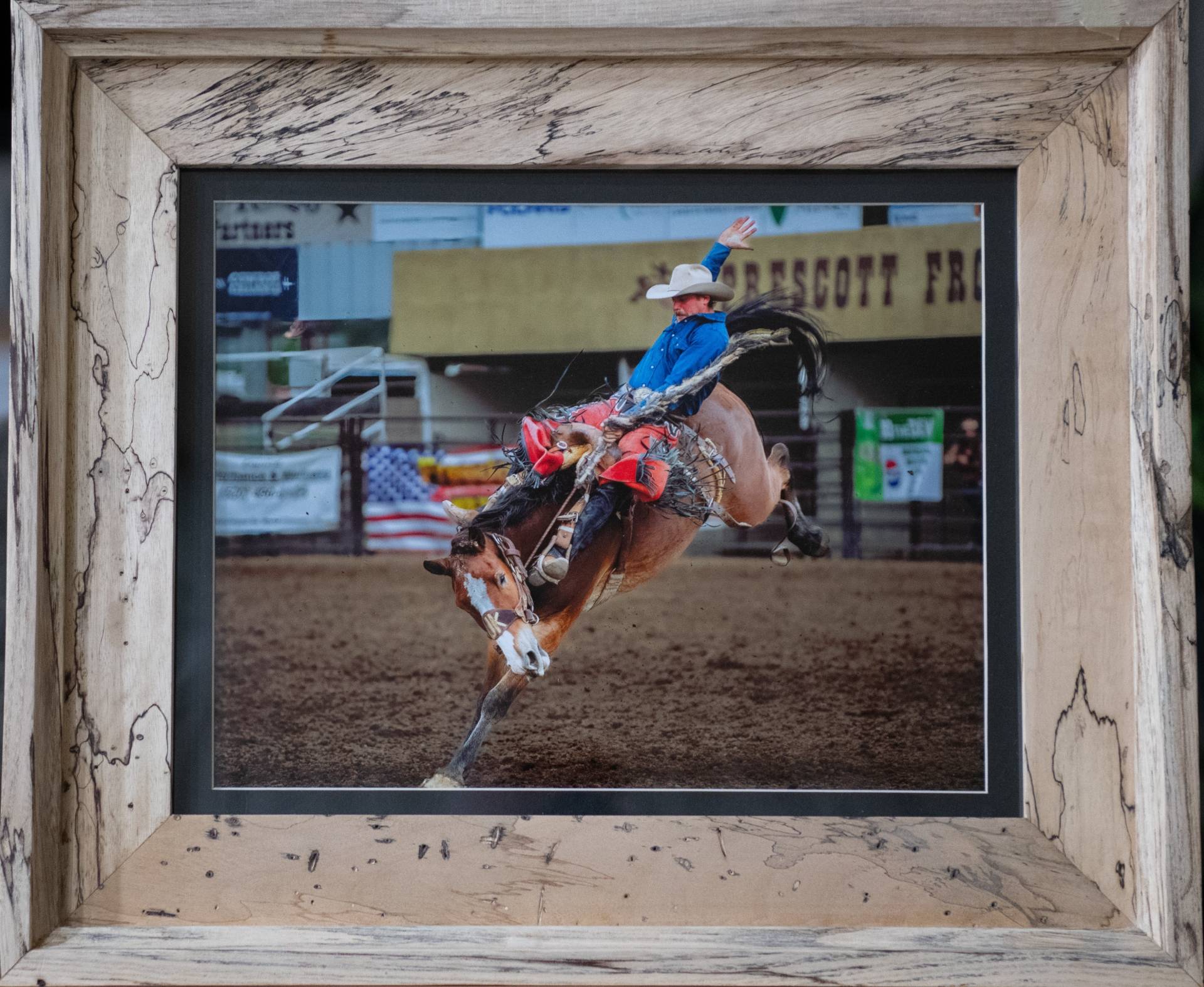 Medium-sized framed picture of a rodeo cowboy riding a brown bronco horse with a black mane