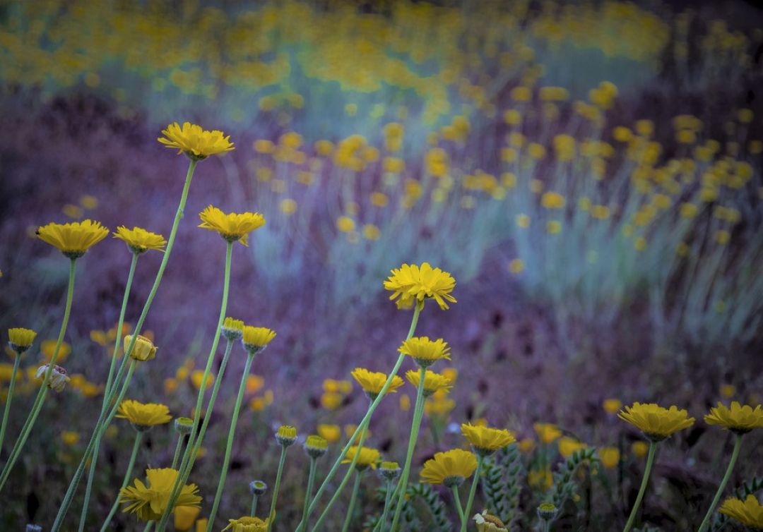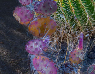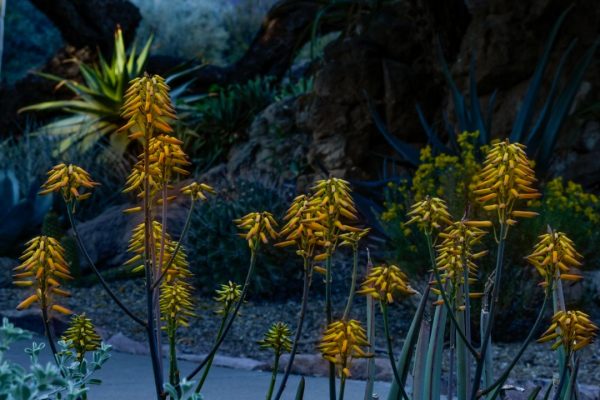 Desert Marigolds, Pink Hedgehog duo, Barrel and Prickly Pear Cacti, and Yellow Aloe Vera flower spikes
