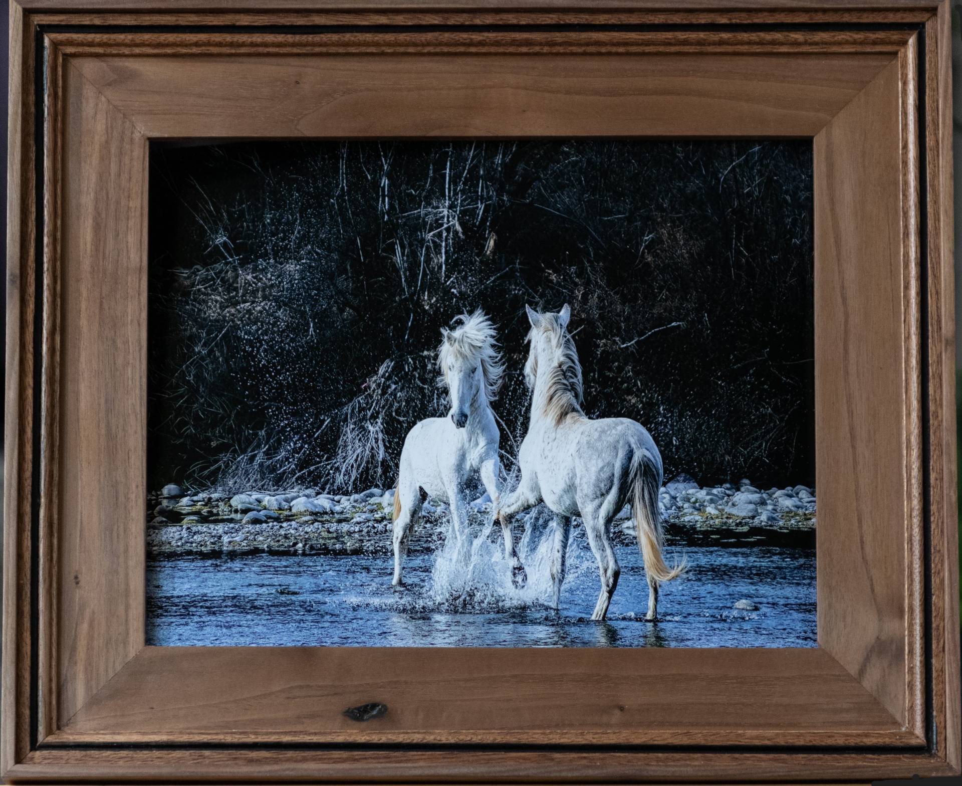 The outer dimensions of this framed print measure 16″ x 19″. The frame is Walnut wood with intricate routed and hand-painted grooves towards the outer edges of the frame.